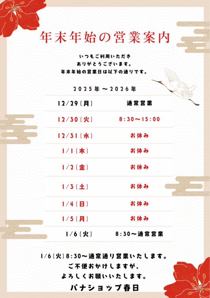 2025年最終営業を12/30(火)15:00まで